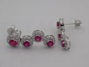 14 karat white gold ruby with diamond halo earrings. The drop earrings each contain 4 round rubies encircled by a halo of round brilliant cut diamonds. The top segment has 12 halo diamonds with the bottom 3 each have 10. On each top segment there is also an offset bezel set round diamond.The total weight of the 8 round rubies is 2.56 carats. The total diamond weight in the halos and the 2 offset diamonds is 0.66 carats of VS diamonds. The "Cascade" design matches our pendant.