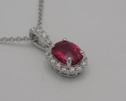 A beautiful 14 karat white gold oval red natural spinel pendant. The vivid 0.82 carat oval cut spinel is set in a diamond halo design with 18 sparkling round brilliant cut VS diamonds, including 4 in the bale. The total diamond weight is 0.20 carats.  The pendant length measures 15 mm, including the bale and is 7 mm wide.  It is shown suspended from a light diamond cut 14 karat white gold cable chain with lobster clasp, which is sold separately.