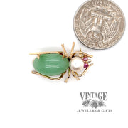 The insect kingdom brings you this girly beetle pin! An oval green jadeite makes up the abdomen and thorax, the head a 7 mm Akoya cultured pearl, and the eyes with 2 small round rubies. The natural green jadeite is a medium tone of light green with slight darker green mottling. The feelers and legs are constructed of heavy 14 karat yellow gold wire. The pin is affixed with a hinge pin assembly and is stamped 14 karat yellow gold.
