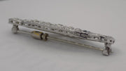 Exquisite edwardian antique filigree diamond bar pin with caliber cut blue sapphires. The pin is a filigree oval shape with a round pinwheel of diamonds at each end separated by a chevron containing six blue caliber cut sapphires. The total number of round OEC (Old European Cut) diamonds is 62 for an estimated weight of 1.39 carats total. It is secured with a standard hinge/pin assembly.