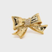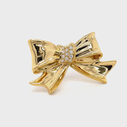 A Herbert Rosenthal designer bow pin done in 18 karat yellow gold and pave set in the center knot of the bow with 11 sparkling round diamonds. The round natural diamonds are VS clarity, near colorless and total approximately .33 carats.