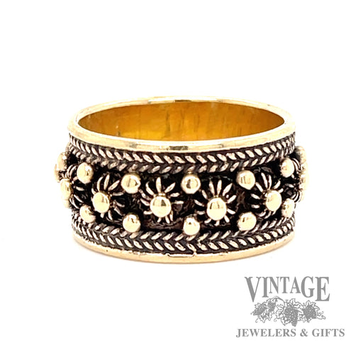 View full detailsStamped 14k yellow gold ring Wide band has vintage raised textured design with floral and braided sections Inscription on interior of band reads "...