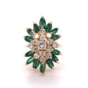 14 karat yellow gold marquise emerald cluster ring with round brilliant cut diamonds.