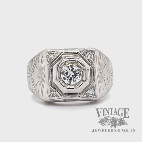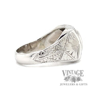 - Antique, 14k white gold (XRF verified) and diamond ring with hand engraved details on the top, sides and shoulders.