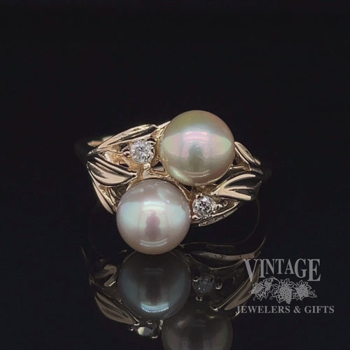 Exquisite silver tone pearls in a 14 karat yellow gold bypass style ring. Each pearl measures approximately 6.5 mm in diameter. The pearls are well matched, with light blemish, slight orient, and good symmetry. They are 1/2 drilled and set on a glue post. In addition to the pearls, the ring features a small round brilliant cut diamond on each side of the bypass. The I1 clarity diamonds have a total weight of .05 carats. They are set in 3 prong heads set as part of the casting. The ring has leaf style buttresses on each side to offer protection for the pearls. The ring is size 6. Â