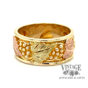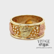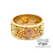 This stylish Black Hills Gold ring is crafted from 12k multi-colored gold, featuring a 9mm width band with a gorgeous grape leaf motif. The ring is available in size 8.
