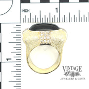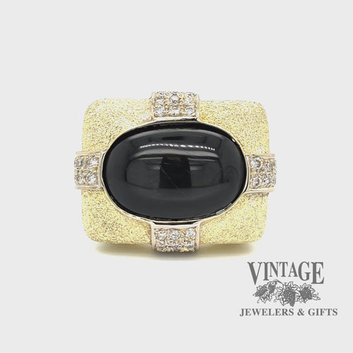 This stunning Black Star Diopside, diamond and 14 karat yellow gold stipple finish estate ring is a true masterpiece. The ring features a stunning black star diopside gemstone, which is known for its unique star-like pattern that appears when the stone is moved in certain light. The diopside is accented with sparkling diamonds and set in a stunning 14 karat yellow gold stipple finish setting. The stipple finish adds a unique texture and depth to the ring, making it truly one-of-a-kind. This ring would make the perfect addition to any jewelry collection and is sure to be a conversation starter wherever you go.