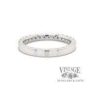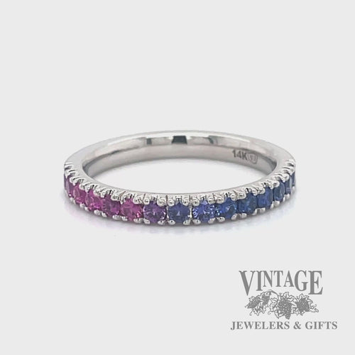 Blue to purple to pink! Expertly crafted in 14 karat white gold by the jewelers at Vintage Jewelers and Gifts, this ring stacker features a handset castle pave design and 15 round, ombré gradient, natural purple, blue and pink sapphires. Finger size 7.25.