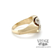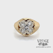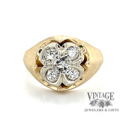A 14k gold ring featuring five diamonds in a unique cluster design. Four Old European cut diamonds with G color and VS clarity add up to .40 carats, while an additional .39 carat, round brilliant G color I1 clarity diamond sits at the center for a total diamond weight of .79 carats (estimated). Finger size 7.