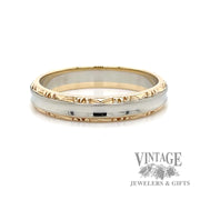 - Two tone 14 karat white gold polished concave center, with embossed decorative edges in 14 karat yellow gold.