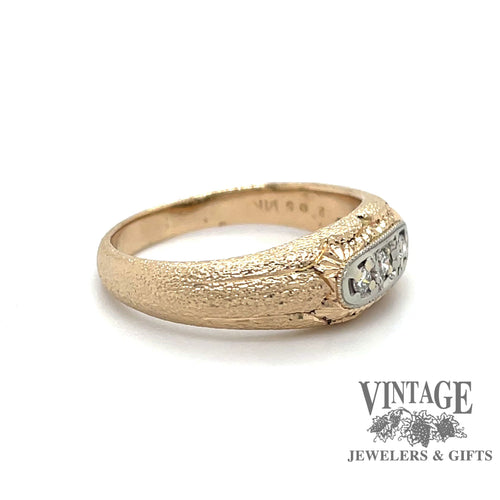Estate yellow gold diamond ring. The 14 karat yellow gold ring contains 3 round brilliant cut SI quality diamonds that have a total weight of 0.18 carats. The diamonds are set in a oval white gold illusion plate with milgrain edging that is set atop the textured stipple finished ring and enhanced with a bright cut engraving surrounding the plate. The tapered ring measures 8.3 mm across the top, 3.5 mm at the bottom and is finger size 12.