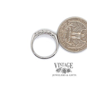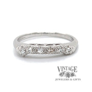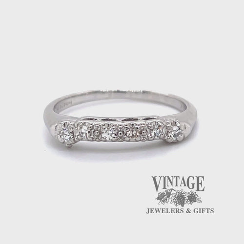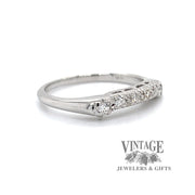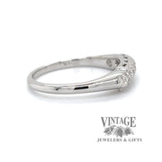 This 18 karat white gold curved diamond band is designed to fit perfectly against this illusion head engagement ring. The band is set with 6 single cut natural diamonds. The diamonds have a total weight of .15 carats of SI quality diamonds. They are illusion set with 4 prongs atop a double gallery setting. The band has protruding ends to fit the engagement ring. The estate ring is size 5.25.