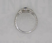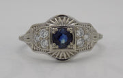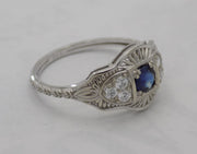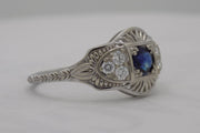 14 karat white gold art deco style mounting with a center .32 carat round blue sapphire. The sapphire is flanked on either side by a triangular pattern of 3 small round brilliant cut VS diamonds with a total diamond weight of 0.18 carats. The ring is size 6.25