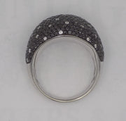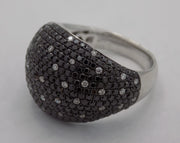 18 karat white gold dome ring containing black pave' diamonds interspersed with white diamonds. The black round brilliant cut diamonds have a total weight of 2.40 carats while the white diamonds total weight is 0.26. The ring is size 6.5