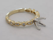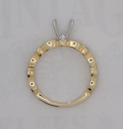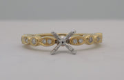 14 karat yellow gold round brilliant diamond semi-mount for 1 carat round diamond.. The semi-mount contains 8 small round brilliant cut diamonds set in a marquise repeating pattern, flanking the center mounting with a total weight of 0.20 carats. The ring is size 6.