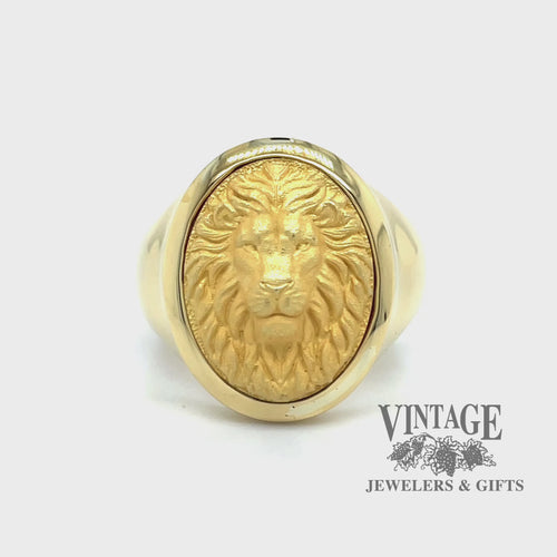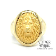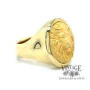 This spectacular lion signet ring pays exquisite detail to the raised lion centerpiece of this 18 karat yellow gold ring. The inside portion of the ring has azures to help the inside of the lion from collecting moisture and dirt allowing for comfort in wearing. The ring top measures 20.26 mm in length. The decorative styling of the lion face is completed with a sandblasted finish, contrasting with the high polish of the ring. The ring is "PURR-FECT"Â for the lion lover in finger size 11.