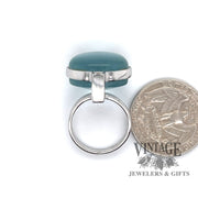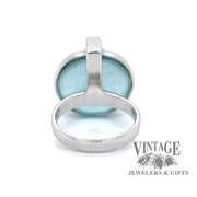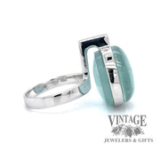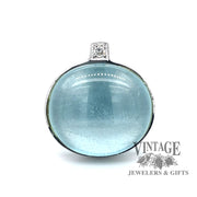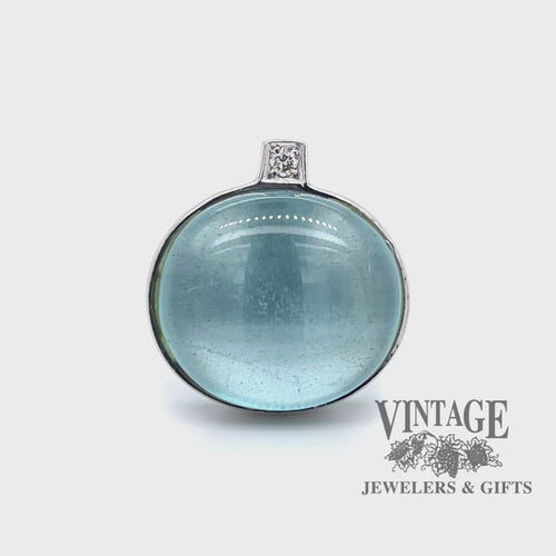 This modernistic show stopping aquamarine ring consists of a natural oval/round cabochon cut aquamarine (beryl) bezel set stone accented at one end by a bright cut prong set diamond. The aquamarine has and estimated weight (by formula) of 23 carats and displays faint parallel striations only slightly visible to the unaided eye. The round brilliant cut diamond weighs approximately .10 carats and is an SI quality diamond. The estate mounting is 18k white gold. Ring is size 6.5