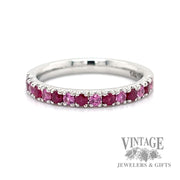 Expertly crafted in 14 karat white gold by the jewelers at Vintage Jewelers and Gifts, this ring stacker features handset castle pave design and 8 round, natural pink sapphires, totaling .32 carats, alternating with 7 round, natural rubies, totaling .28 carats. Perfect for adding a touch of color and elegance to any outfit. Available in size 7.