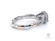 This ring, by designer Verragio, contains a single round brilliant cut center diamond weighing .96 carats. The diamond is certified by GIA in report #1213546989 and is Color F, Clarity SI1. It has Excellent Cut, Polish and Symmetry and is laser inscribed with the report number. The 14 karat white gold mounting is very similar to Verragio #Parisian105X-R with a total accent diamond weight of .35 carats set in a pave' style in a twisted diamond band with a "Stardust" halo of diamonds surrounding the center diamond. In addition to beading finish treatment, the ring has rose gold wraps. The ring is size 5.