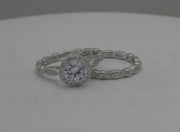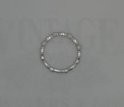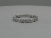 A 14 karat white gold diamond band. The band contains 4 marquise shaped sections, each section containing 3 small round brilliant cut diamonds. The sections are separated by a square design that continues onto the side of the band. Each square contains a single diamond on top and 2 surprise diamonds, 1 on each side of the band totaling 3 in each square. The two end sections are in the shape of a triangle, each set with 1 diamond. The total weight of all 23 SI diamonds is 0.10 carats. The design is framed with a milgrain finish. The back of the shank is solid, with no stones, and alternates in marquise and square shapes. The narrow and very feminine band is 2.5 mm wide and is finger size 6. There is a matching engagement ring sold separately.