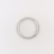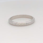 White gold engraved wedding band. This 18 karat white gold hand engraved wedding band measures 3 mm in width and is size 9.25. The ring is a circlet with the engraving on three sides all the way around.
