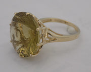 10 karat estate round lemon citrine ring. The fantasy cut citrine measures 18 mm in diameter and has an estimated weight of 19 carats. It is prong set atop a fancy gallery comprised of curlicue and fleur-de-lis shaped wire with a plain, slightly split shank. The ring is size 6.