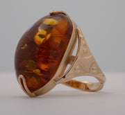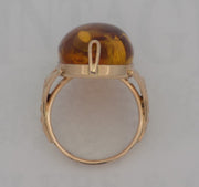 14 karat rose gold amber ring. The oval amber weighs approximately 10 carats and is secured with a "U" shaped prong at each end and is set atop a solid gallery. The bezel is flanked on either side by a embossed buttress that is connected to a plain shank. The ring is stamped with a soviet hallmark on the outside of the shank and is a size 6