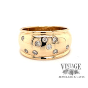 Ladies 10 karat yellow gold estate diamond "cigar" style band ring. It is wide, round, slightly domed and tapered, with flared edges. The band measures 10.3 mm in width on top and 5.6 mm on the bottom. There are 9 small round brilliant cut diamonds in a scattered pattern across the top of the band. The diamonds are I1 quality with an estimated total weight of 1/4 carat and are flush set. The ring has a high polish and is size 6.25.
