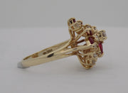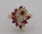 14 karat yellow gold estate marquise ruby and round brilliant cut diamond waterfall style cluster ring. The approximate total weight of the 10 marquise shaped rubies is 1.60 carats and the 12 VS round diamonds is 0.38 carats. The ring is size 6.75.