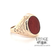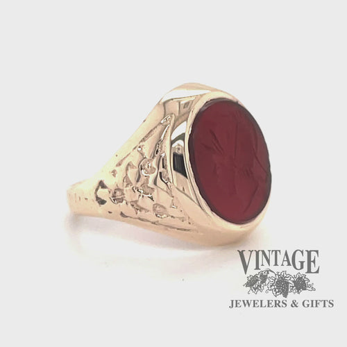 9 karat yellow gold estate sardonyx "intaglio" ring. Etched atop the stone is a depiction of a soldier’s head. The stone is bezel set with embossed shoulders on the shank and the ring is size 5.5.
