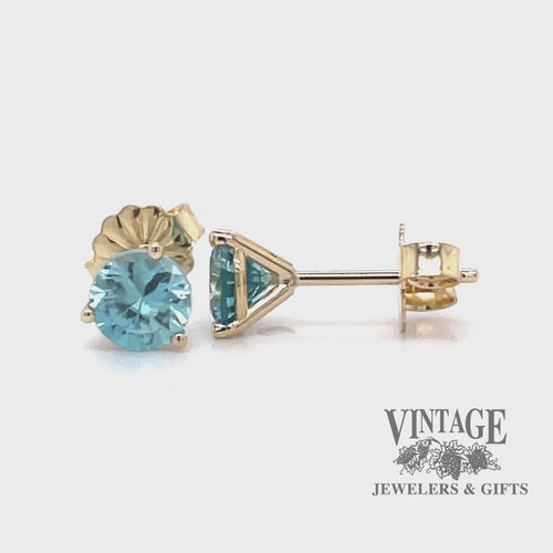 Two natural round blue zircons totaling 1.45 carats (.75 & .74 carats each) are set in 14 karat yellow gold martini studs. They are secured with ear post and premium friction ear backs.