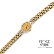 A ladies, tailored style, 14 karat yellow gold Geneve diamond bracelet watch featuring an oval cushion shaped case surrounded by a diamond bezel with additional diamonds set in "snaffle bit" style link connectors at 6 and 12. The connectors attach to the panther style yellow gold link bracelet. The diamonds in the case bezel and connectors number 49 with an estimated total weight of .50 carats. They are full cut SI quality diamonds and are bright cut into the metal of the bezel and connecting links. In addition there are 12 small diamonds set on the dial at each of the hour marks. The movement is a Swiss quartz 4 jewel by Ronda. It is secured by a foldover clasp with 2 sizing options and is 6.25" in length.