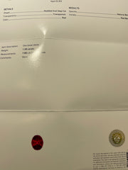 Only found in the mountains of Utah, with an estimated 6000 carats ever mined of gem quality red beryl. Just 10% were over 1 carat in size, with most of those stones being heavily included, and clarity enhanced. At 1.58 carats, this is the rarest, of an already rare gemstone, with no eye visible inclusions, no treatment and no clarity enhancement of any king, making this oval shaped natural red beryl one of the finest specimens available.