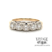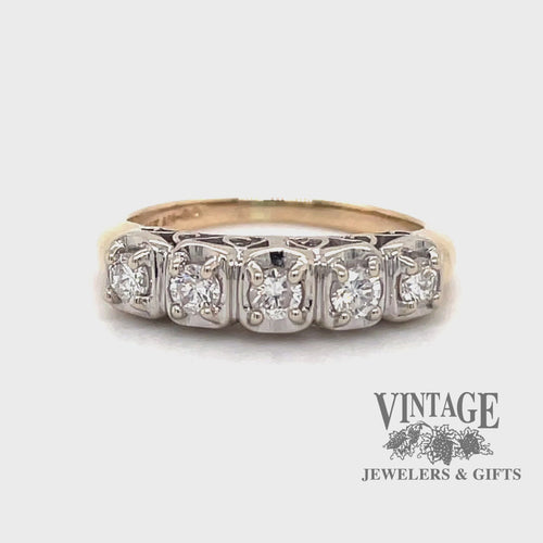 This band contains 5 round brilliant cut diamonds prong secured in an illusion setting running across the finger. The white gold prongs are elevated above a solid plain yellow gold shank. The 5 diamonds have a total weight of .50 carats. They are average SI quality. This vintage ring is 14 karat gold and is size 5.5.