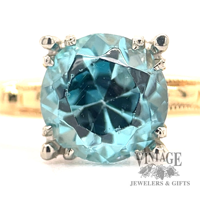 A gorgeous round blue zircon is set in this vintage 14k yellow gold ring.