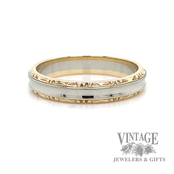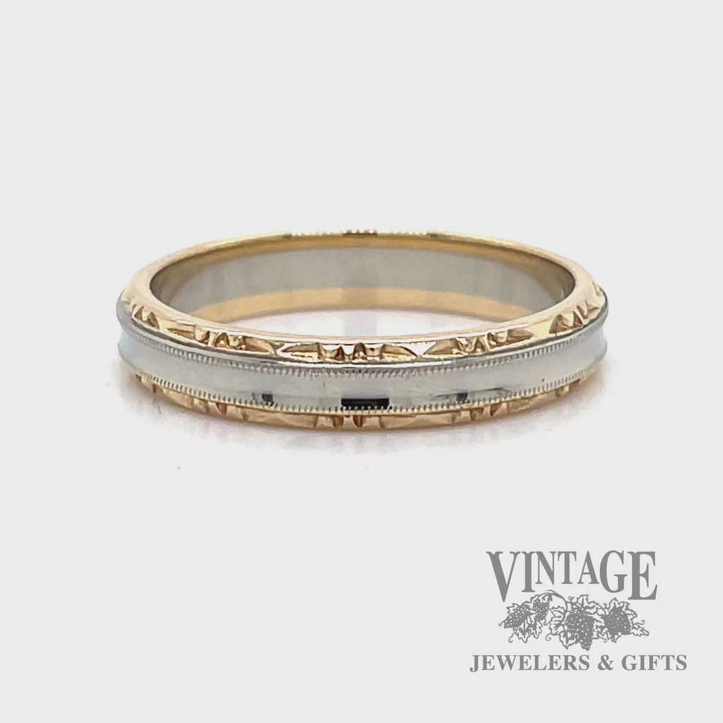 - Two tone 14 karat white gold polished concave center, with embossed decorative edges in 14 karat yellow gold.