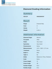 - Center stone is a .46 carat, H color, I1 clarity, natural diamond and is laser inscribed with CEL and serial number 58582900101.