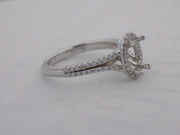 14k white gold diamond semi mount engagement ring for a 1.00 carat oval diamond or 5 mm X 7 mm gemstone. The mounting contains 1/3 carat accent diamonds set in a halo design with 20 pinpoint diamonds on each side of the split shank. Now a finger size 6.5